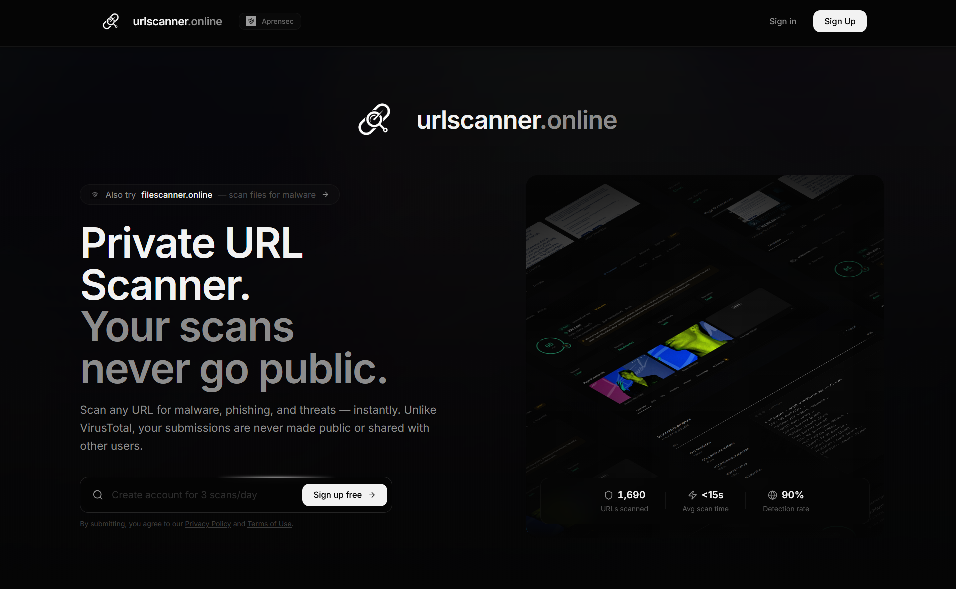 The core difference: When you submit a sensitive URL to urlscan.io on the free tier, that scan is publicly indexed. Attackers can monitor urlscan.io for their own domains being investigated. On URLScanner.online, your submissions are never stored publicly, never indexed, and never shared.