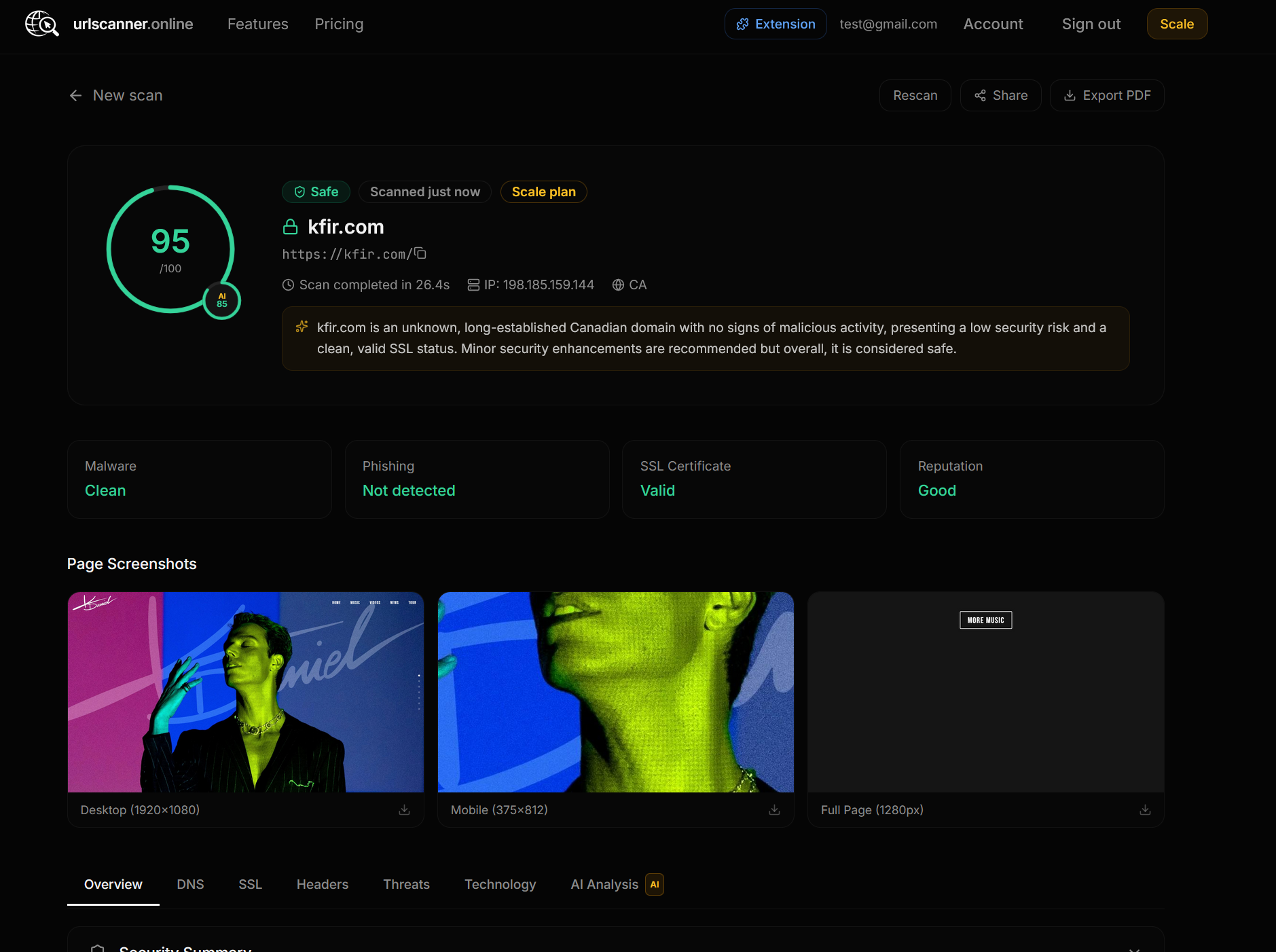 Yes, URLScanner.online is free. Guests get 1 scan without signing up; free accounts get 3 scans per day. Each scan includes full threat detection, SSL certificate analysis, DNS records, HTTP header inspection, WHOIS data, technology detection, and multi-device screenshots.