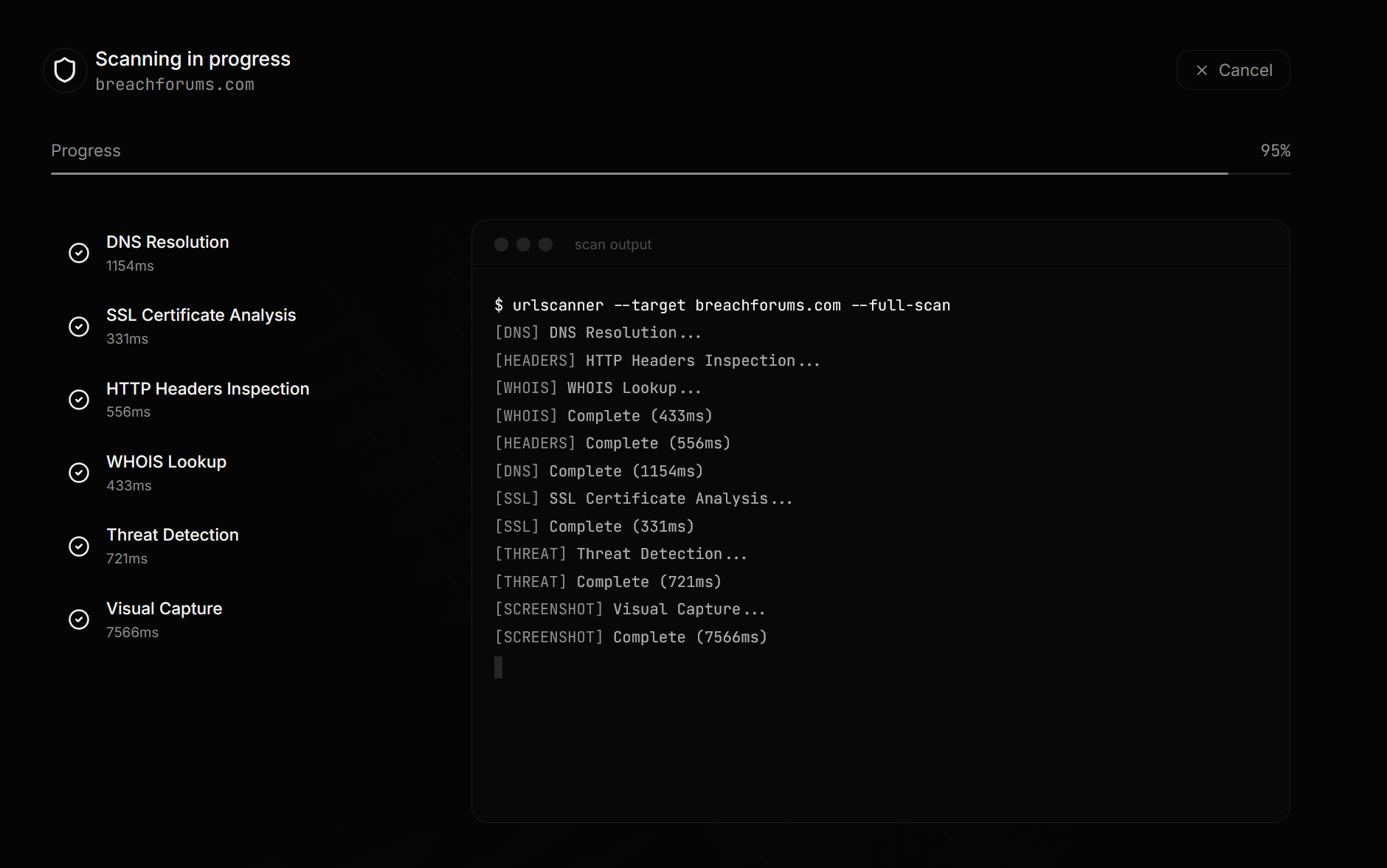 Most scans complete in under 15 seconds. Free scans with no account required. Real-time terminal output shows every step of the analysis as it happens.