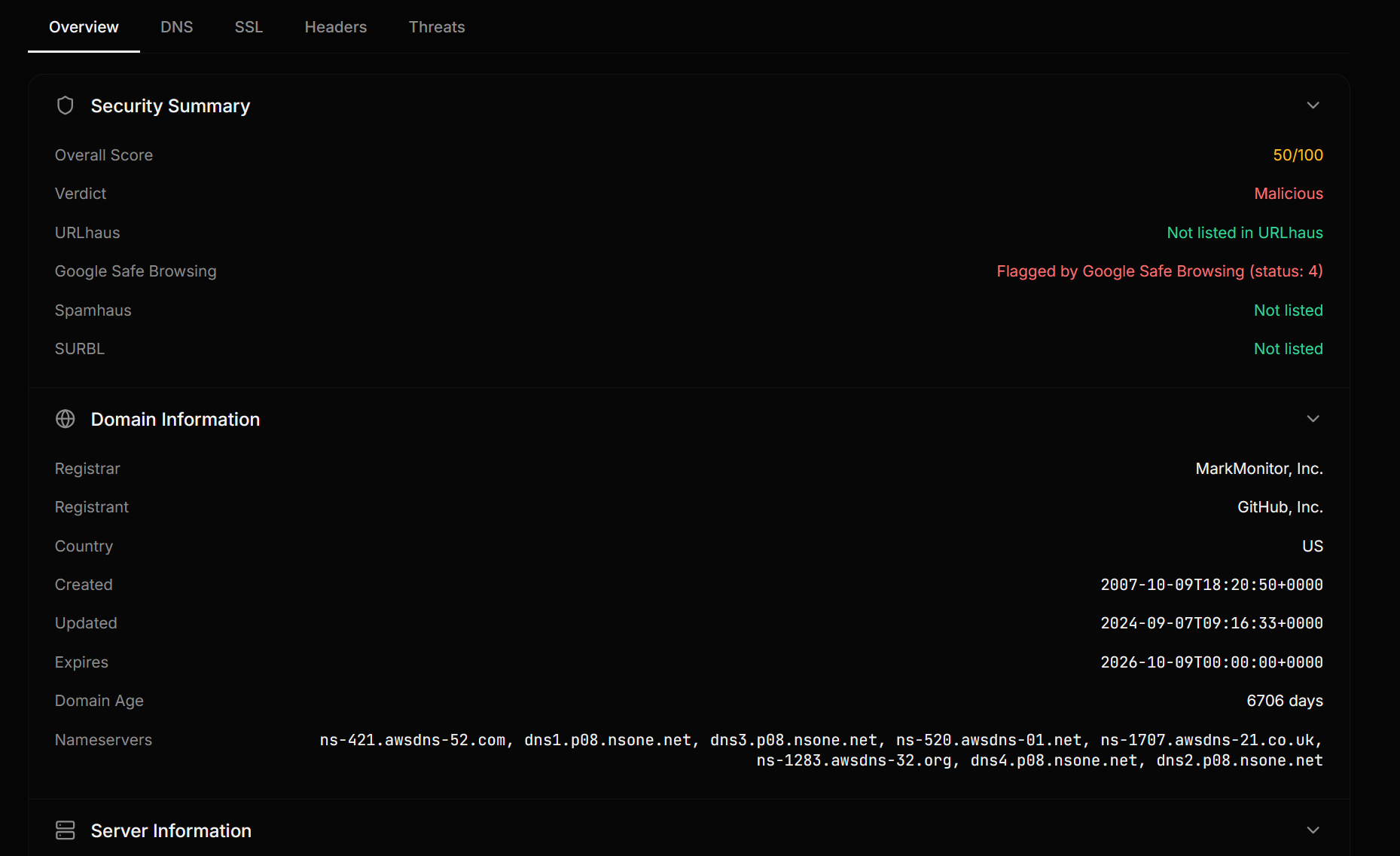 Domain registration data including registrar, creation date, domain age, and expiry. Young domains are flagged as higher risk for cyber security threats.